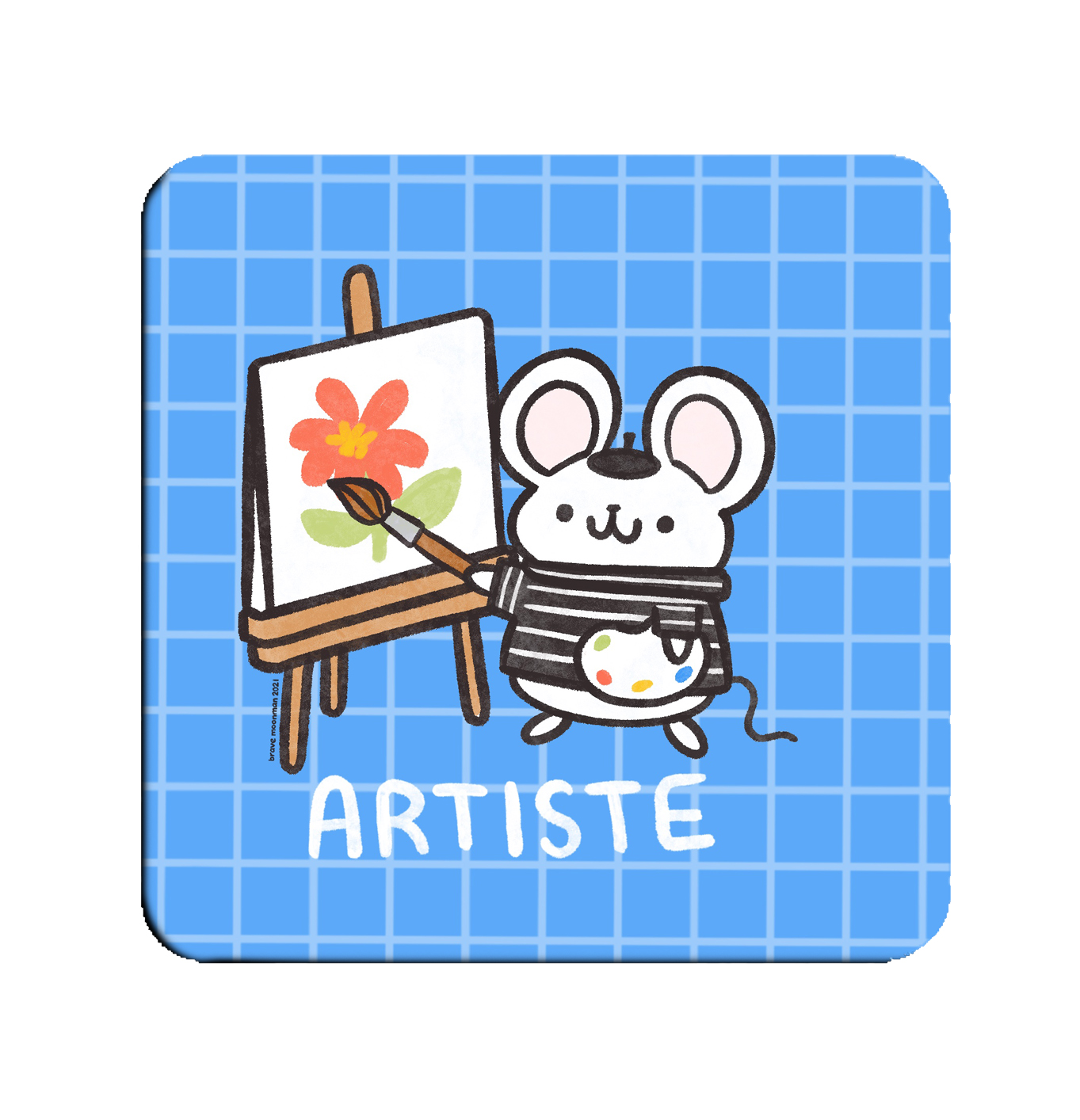 Cute vinyl sticker featuring a little artist mouse painting a flower! Caption reads “Artiste.”