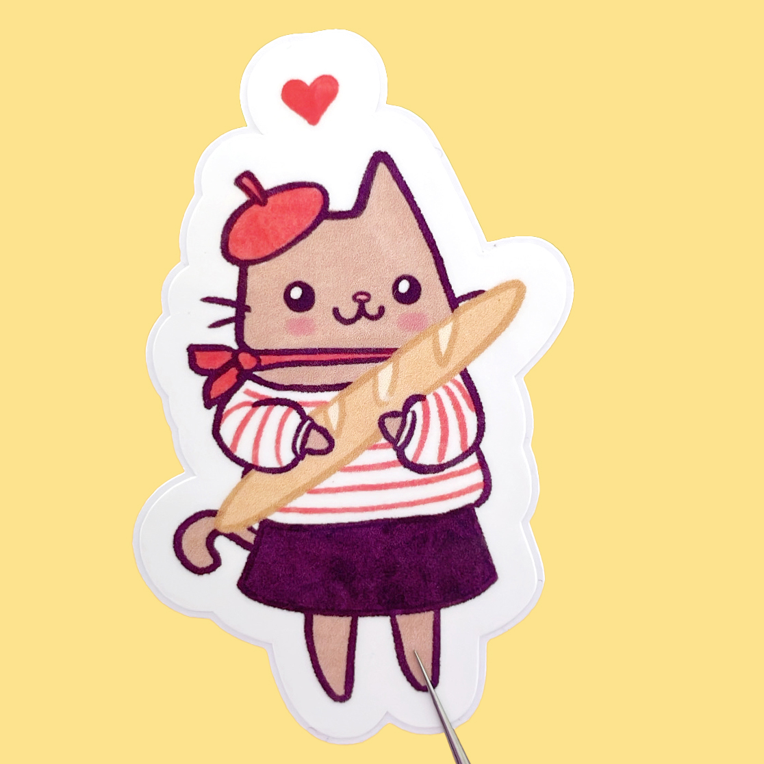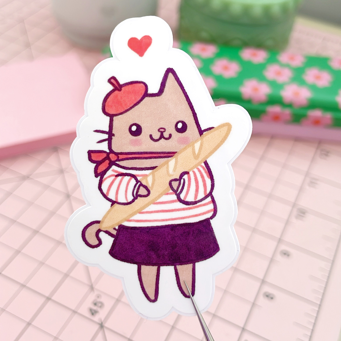 Cute 2.5″ vinyl sticker featuring a French kitty who loves bread!