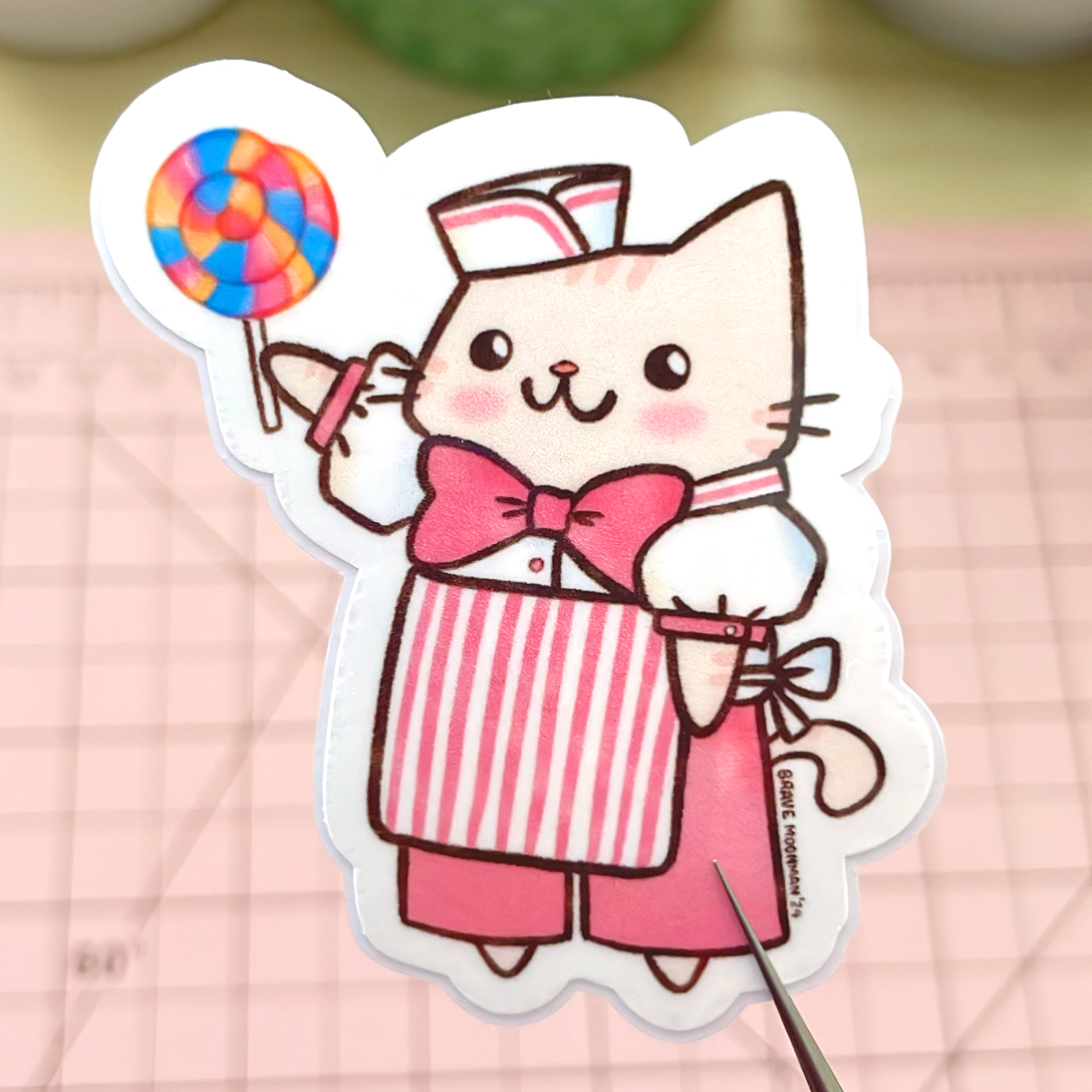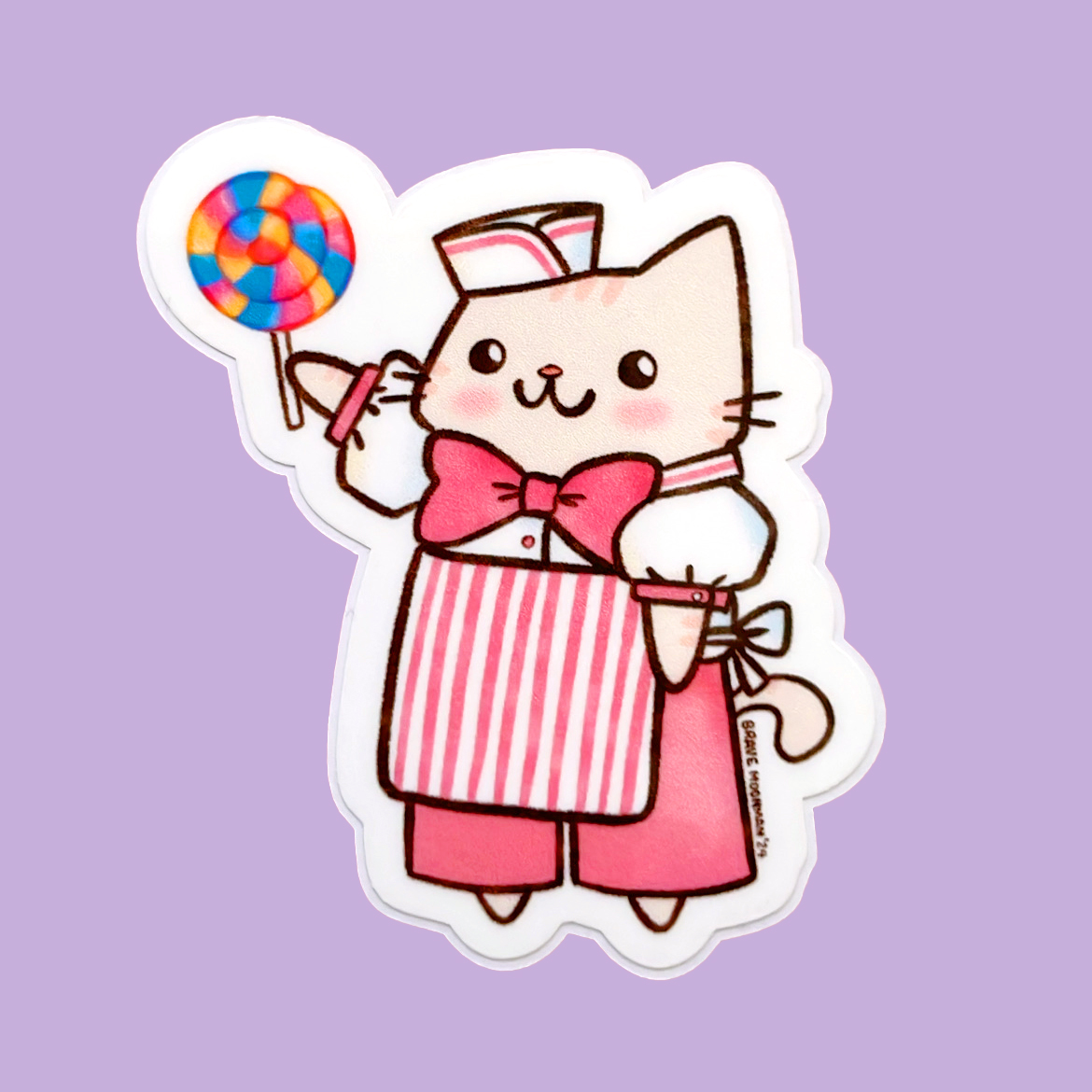 This cute vinyl sticker features Candy Cat selling lollipops!