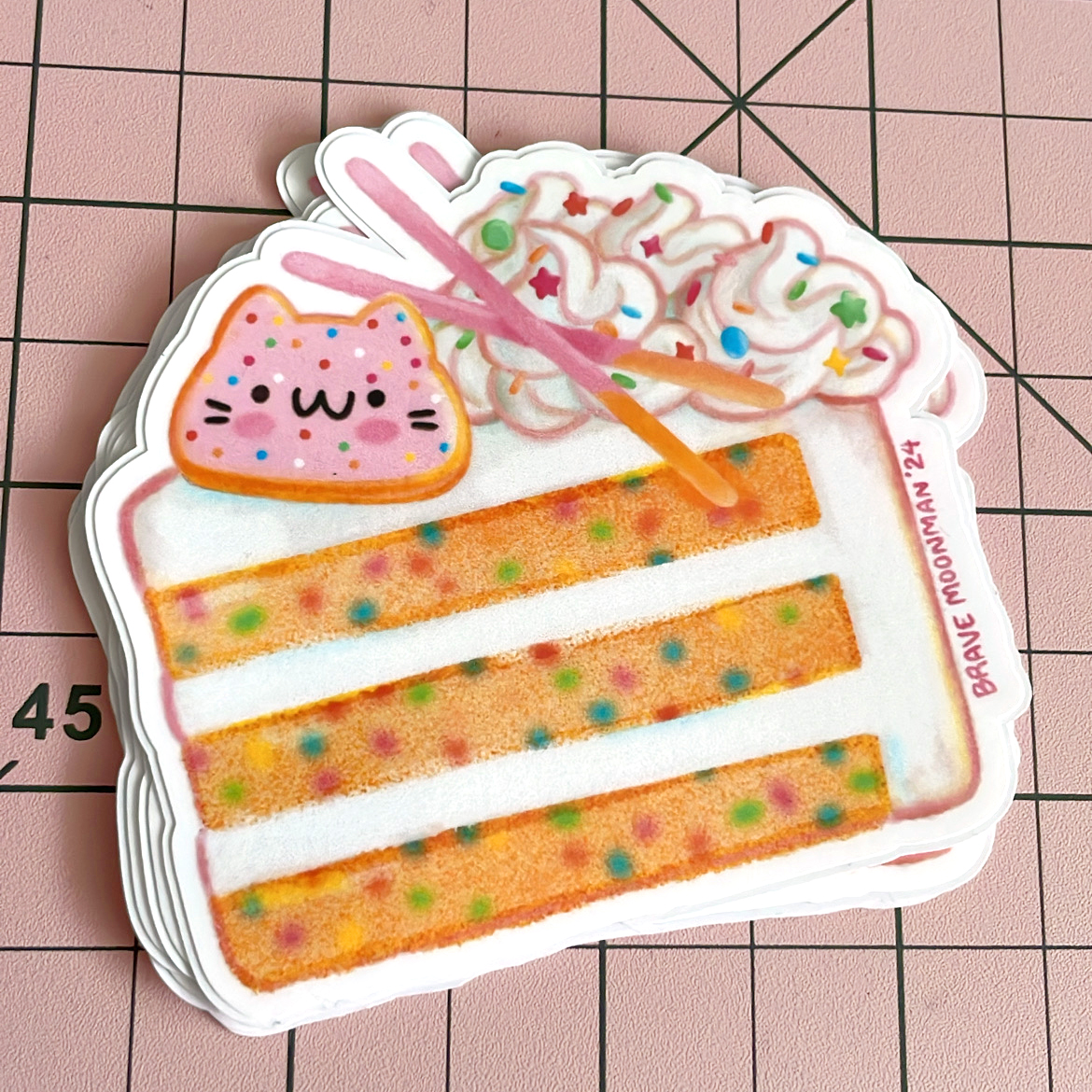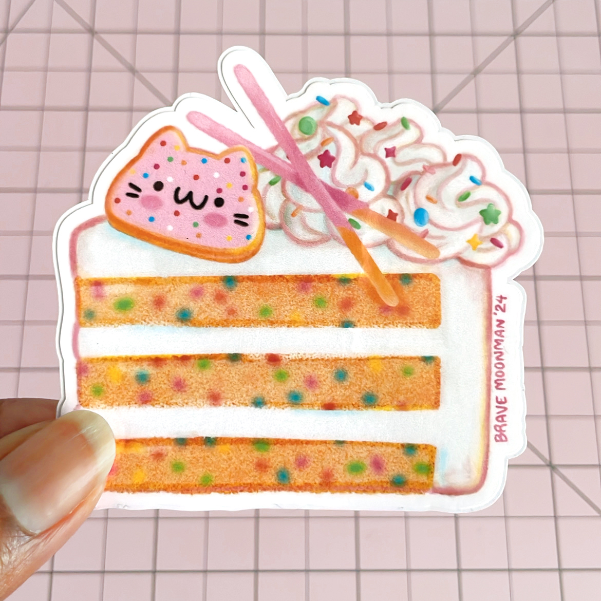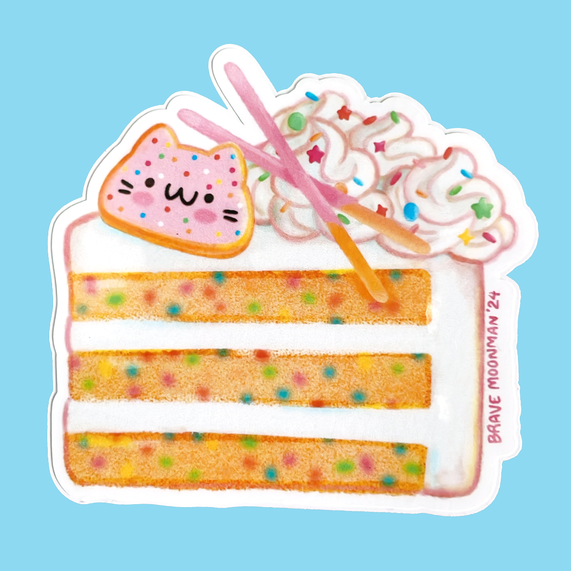 This cute vinyl sticker features a pink, sprinkled cat cookie, on top of a slice of tasty confetti cake!