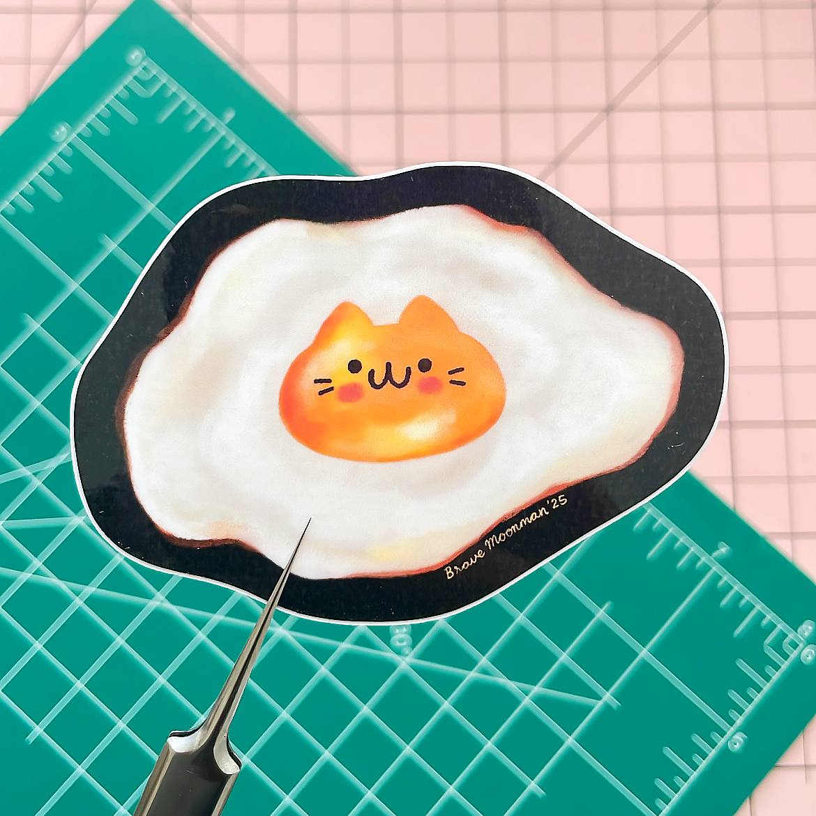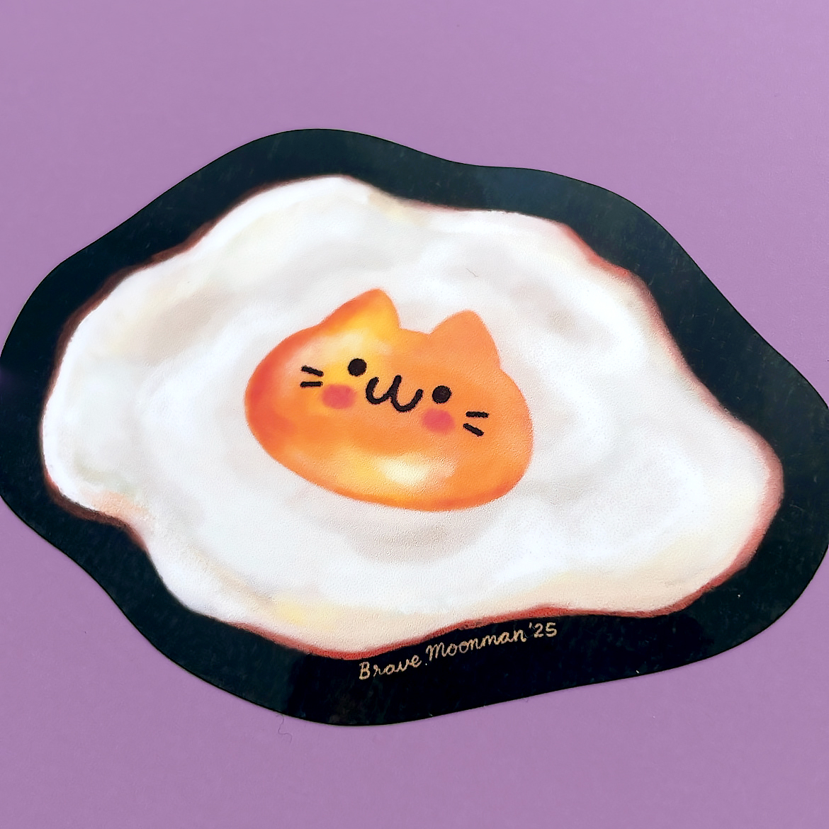 This cute vinyl sticker features a fried egg with a cute cat shaped yolk!