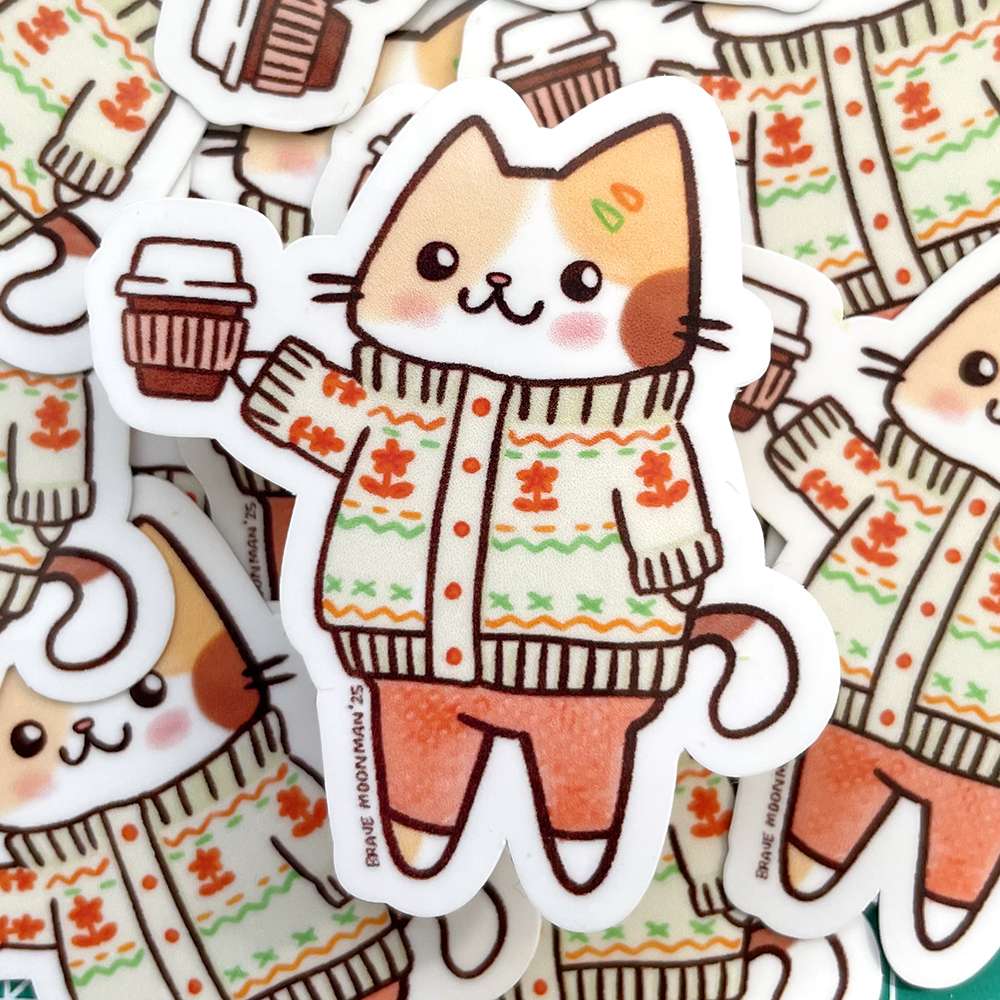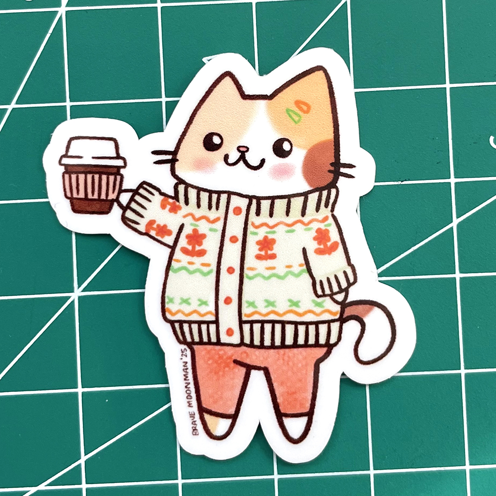 This cute vinyl sticker features a sweet cat in a cozy sweater with a hot cup of coffee to-go!
