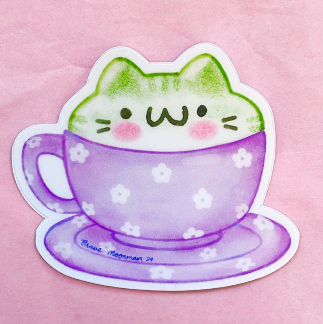 This cute vinyl sticker features a tasty matcha latte with cat shaped foam, in a cute purple cup!