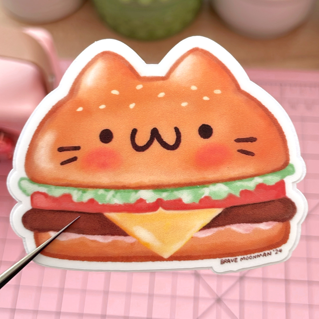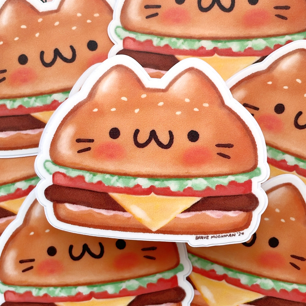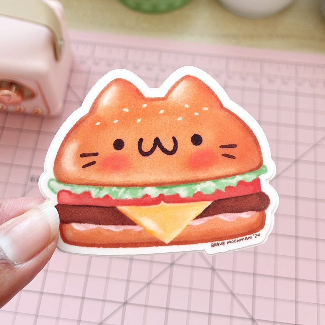 This cute vinyl sticker features a cute and tasty looking cat-shaped burger!