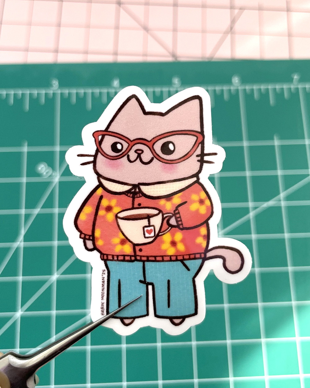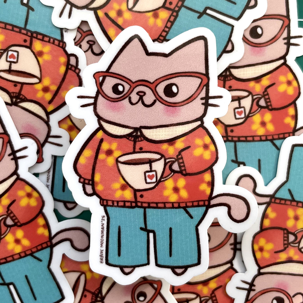 This vinyl sticker features a cute little cat with a nice cup of tea!