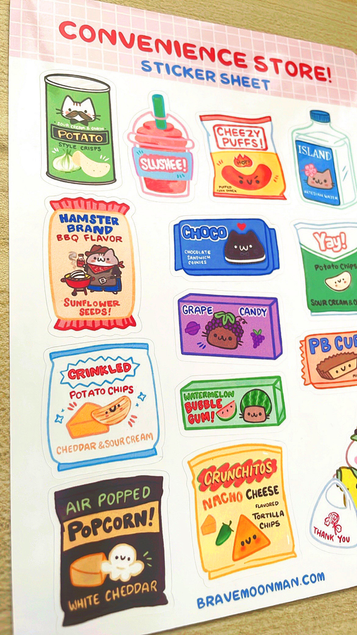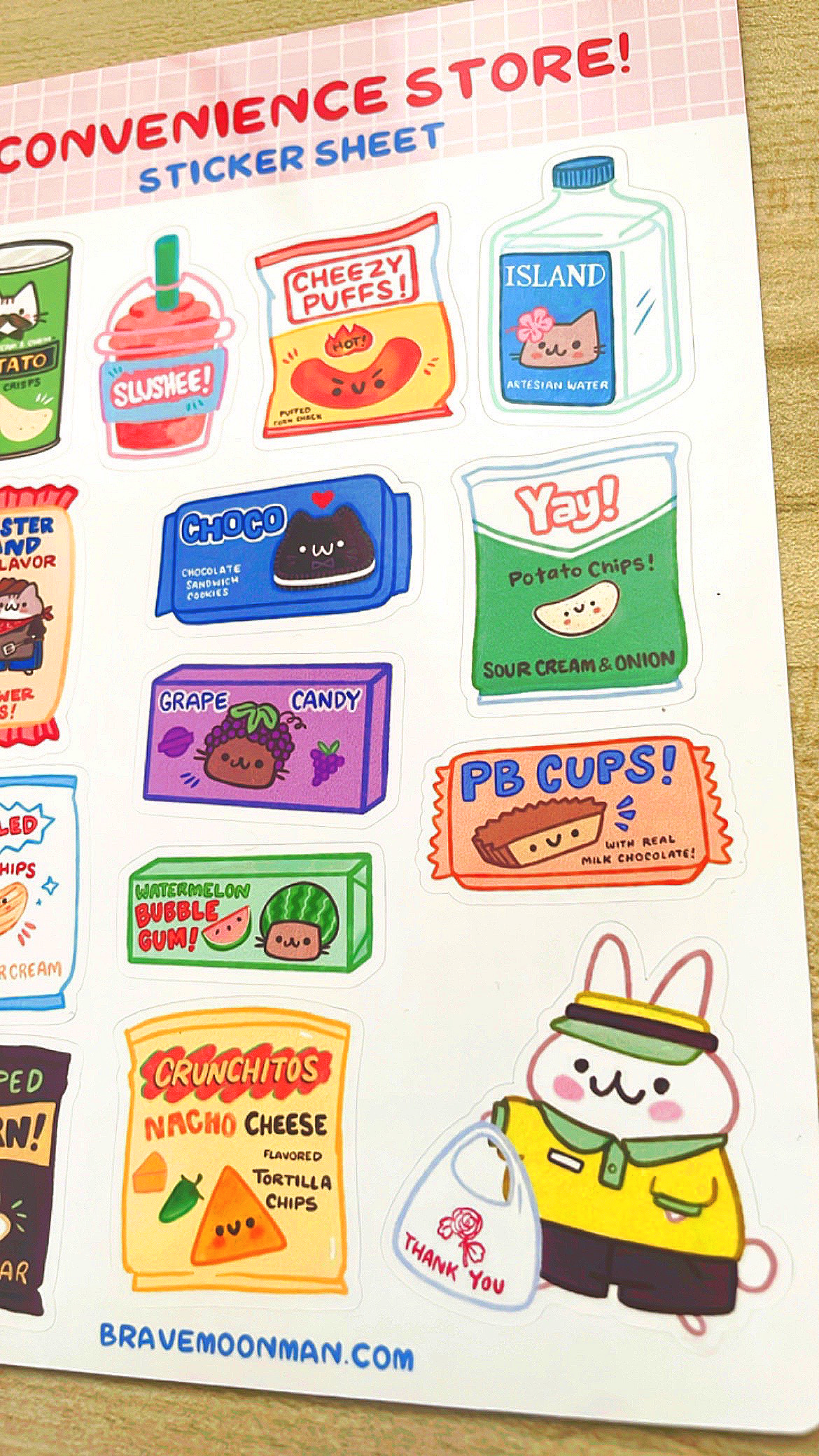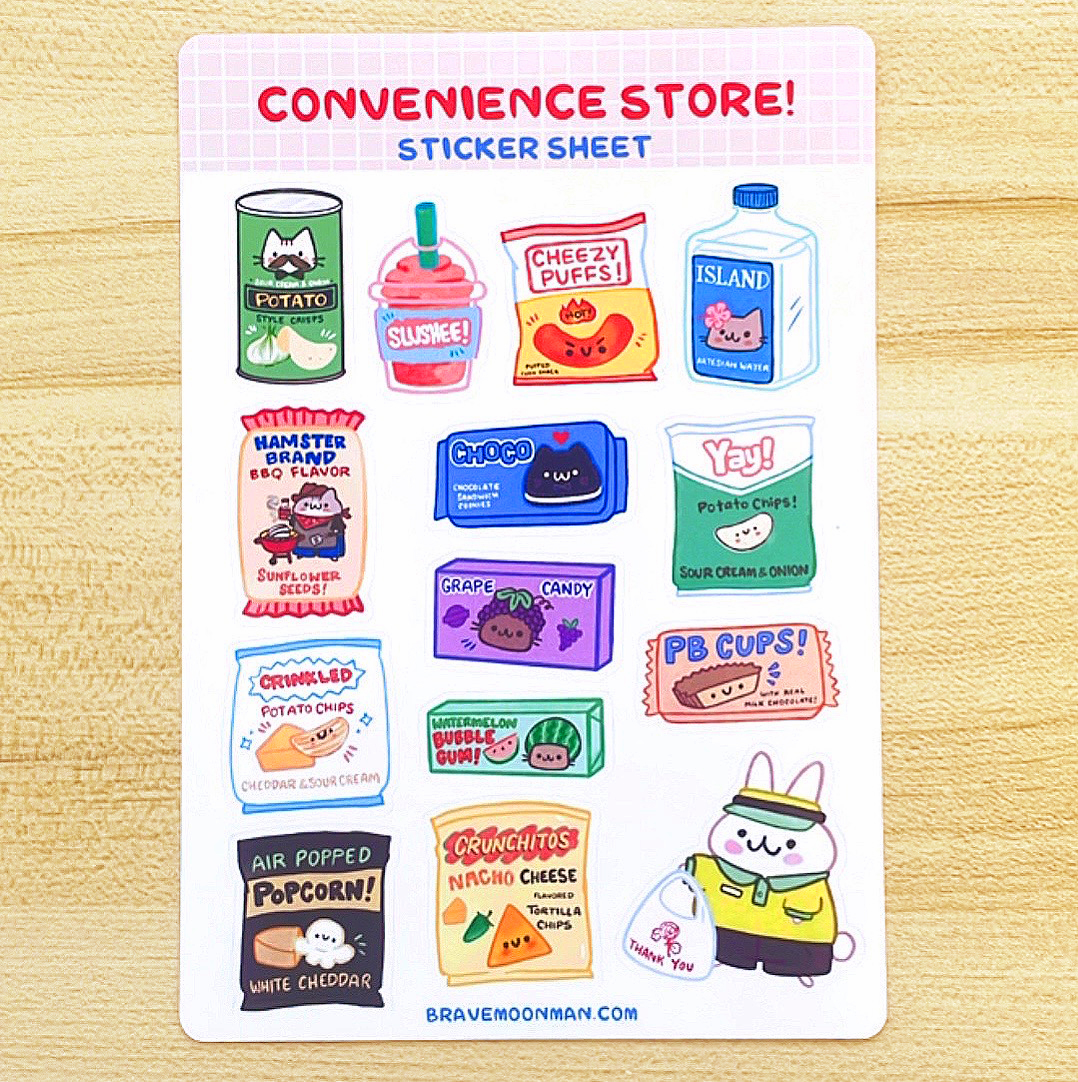 This cute sticker sheet features some tasty junk food you’d find at a convenience store, as well as a cute bunny clerk!