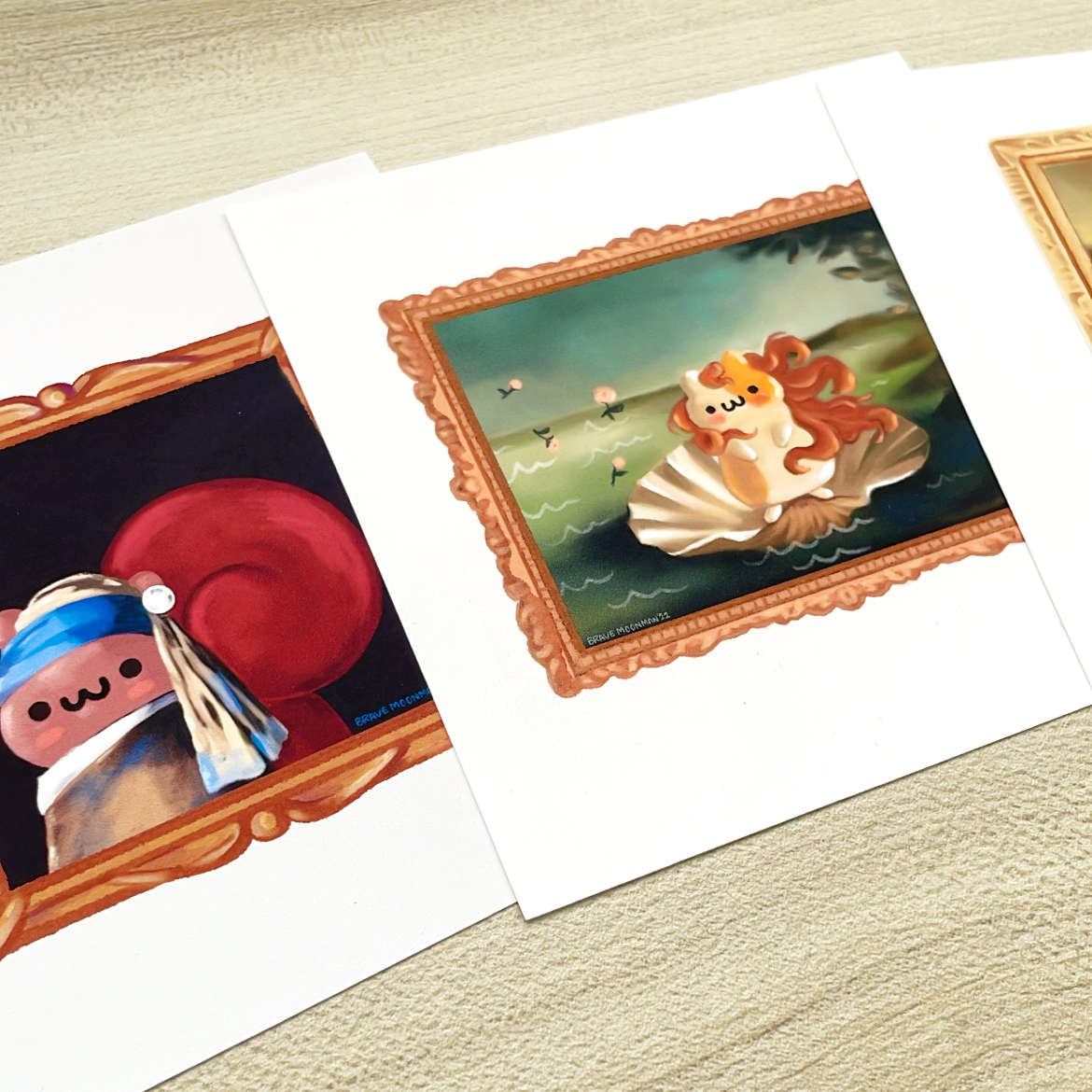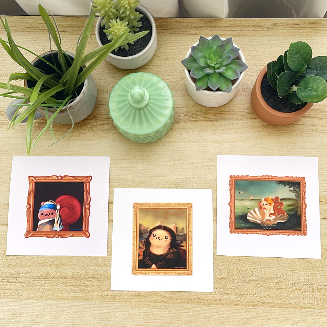 This mini print set features three iconic painting subjects transformed into cute animals: “Meow-na Lisa”, “The Squirrel with a Pearl Earring”, and The Birth of Hamster Venus!