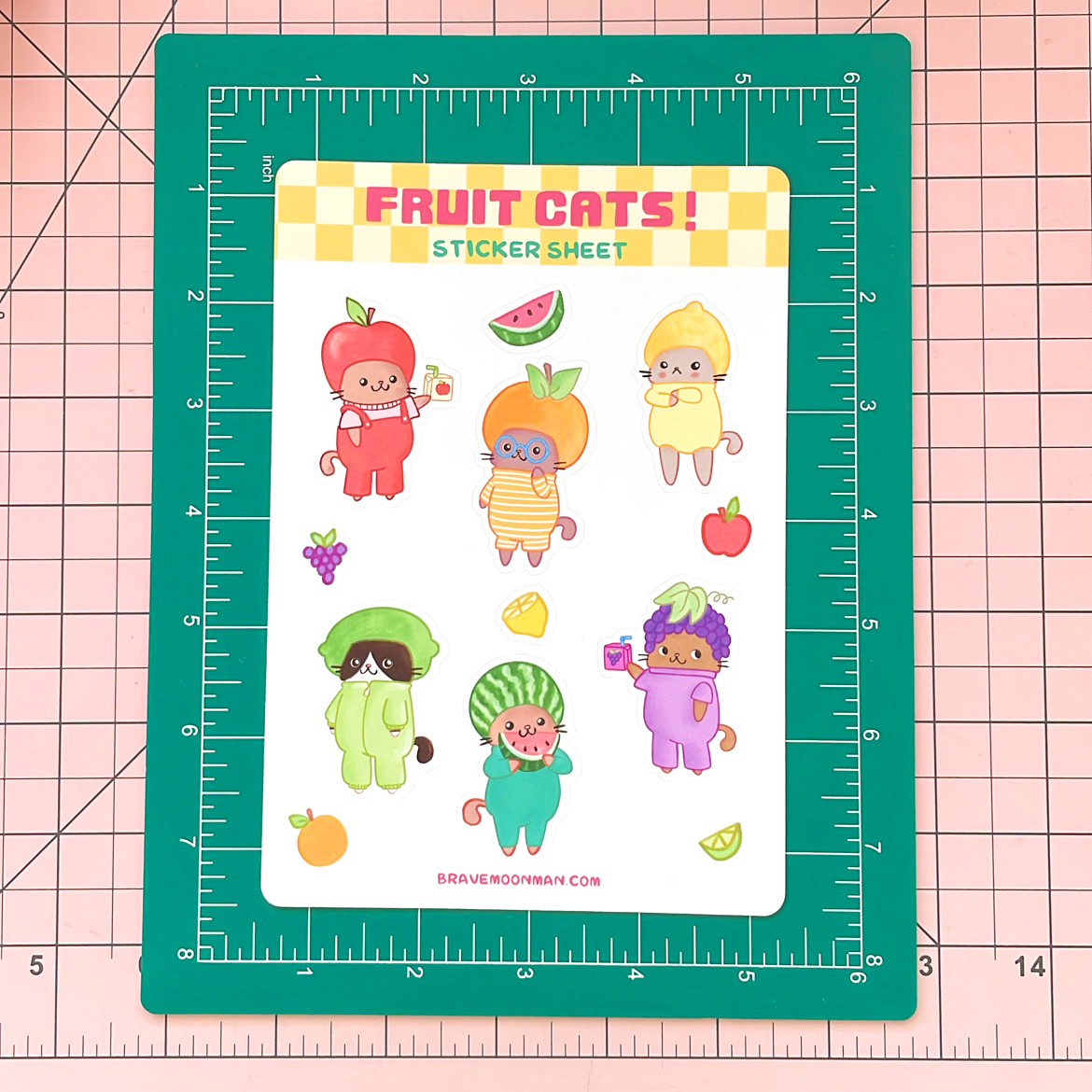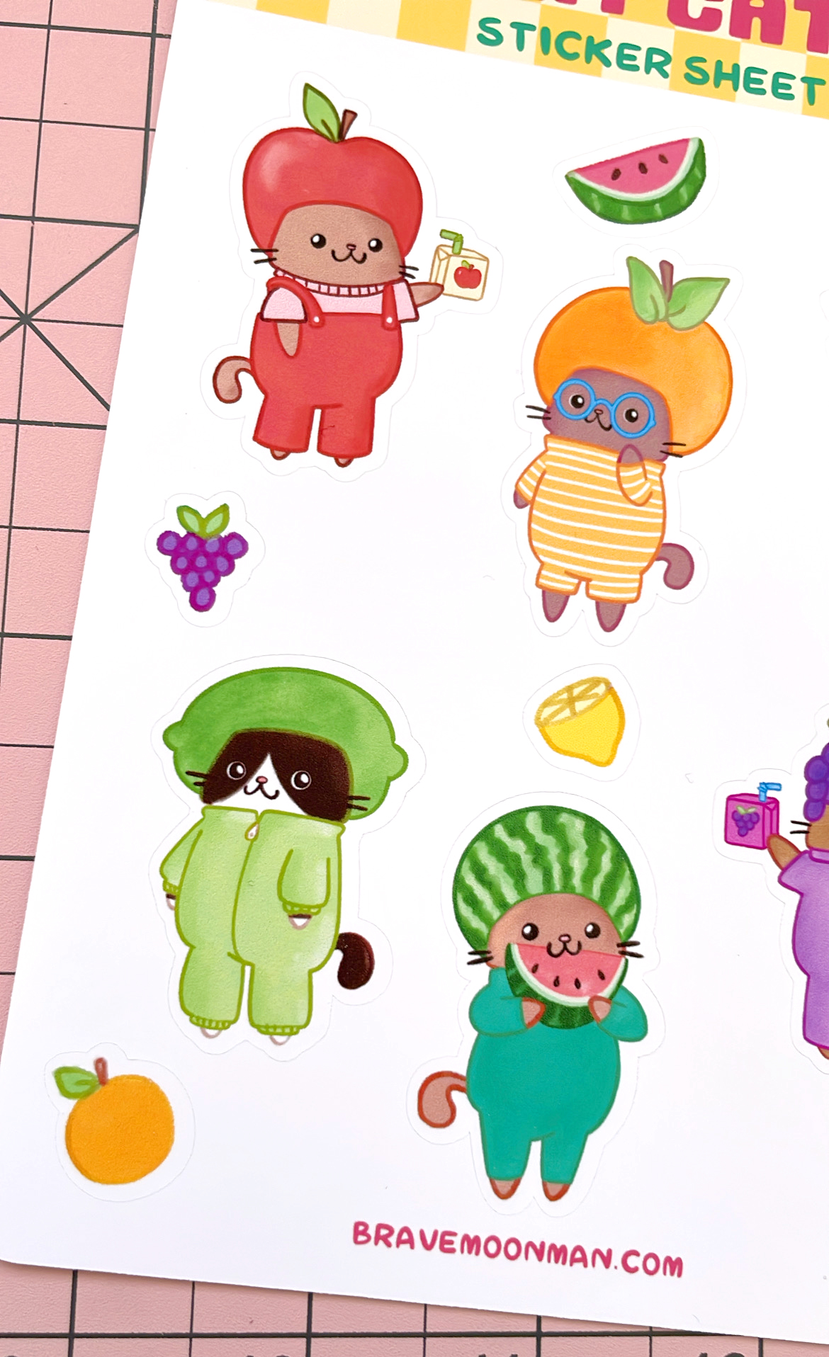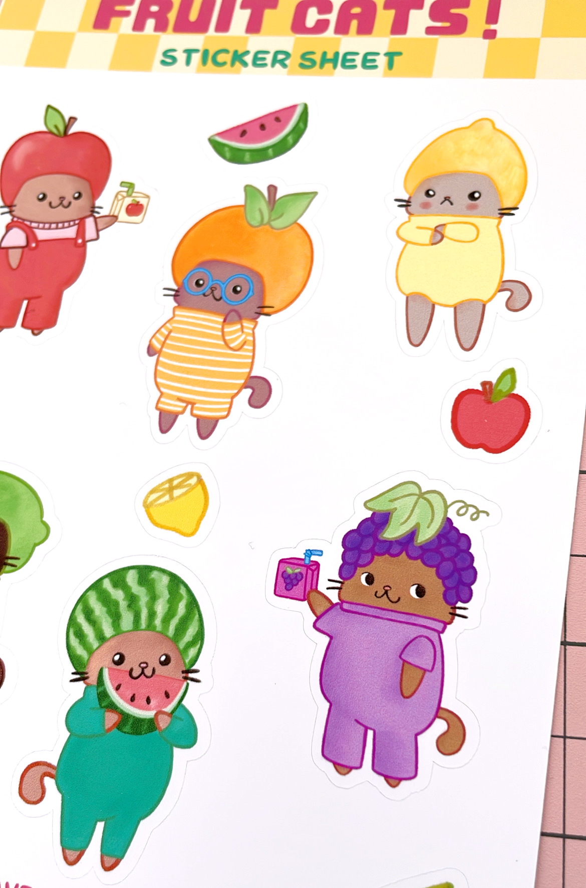 This sticker sheet features 6 cute cats dressed like sweet and delicious fruits!