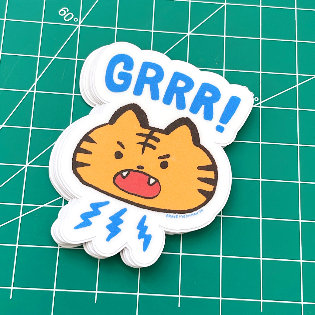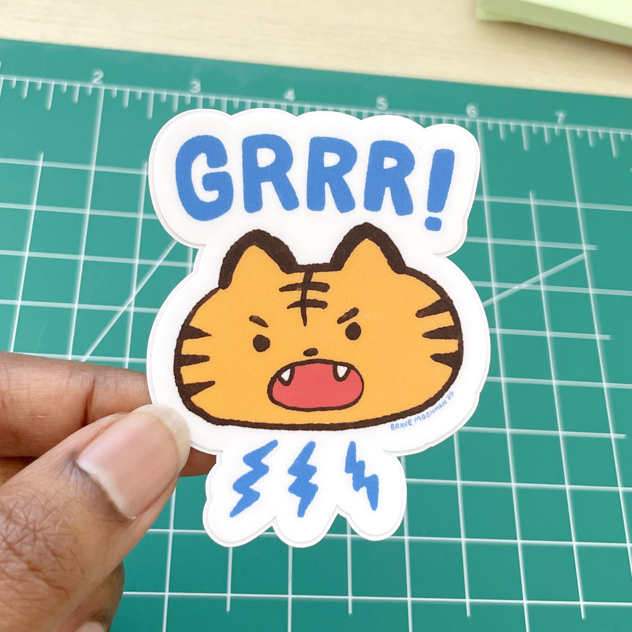 This cute vinyl sticker features an angry, growling tiger! Caption reads “Grrr!”