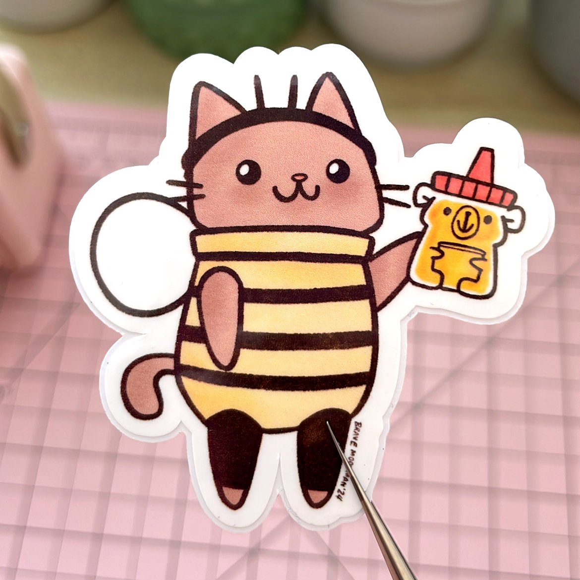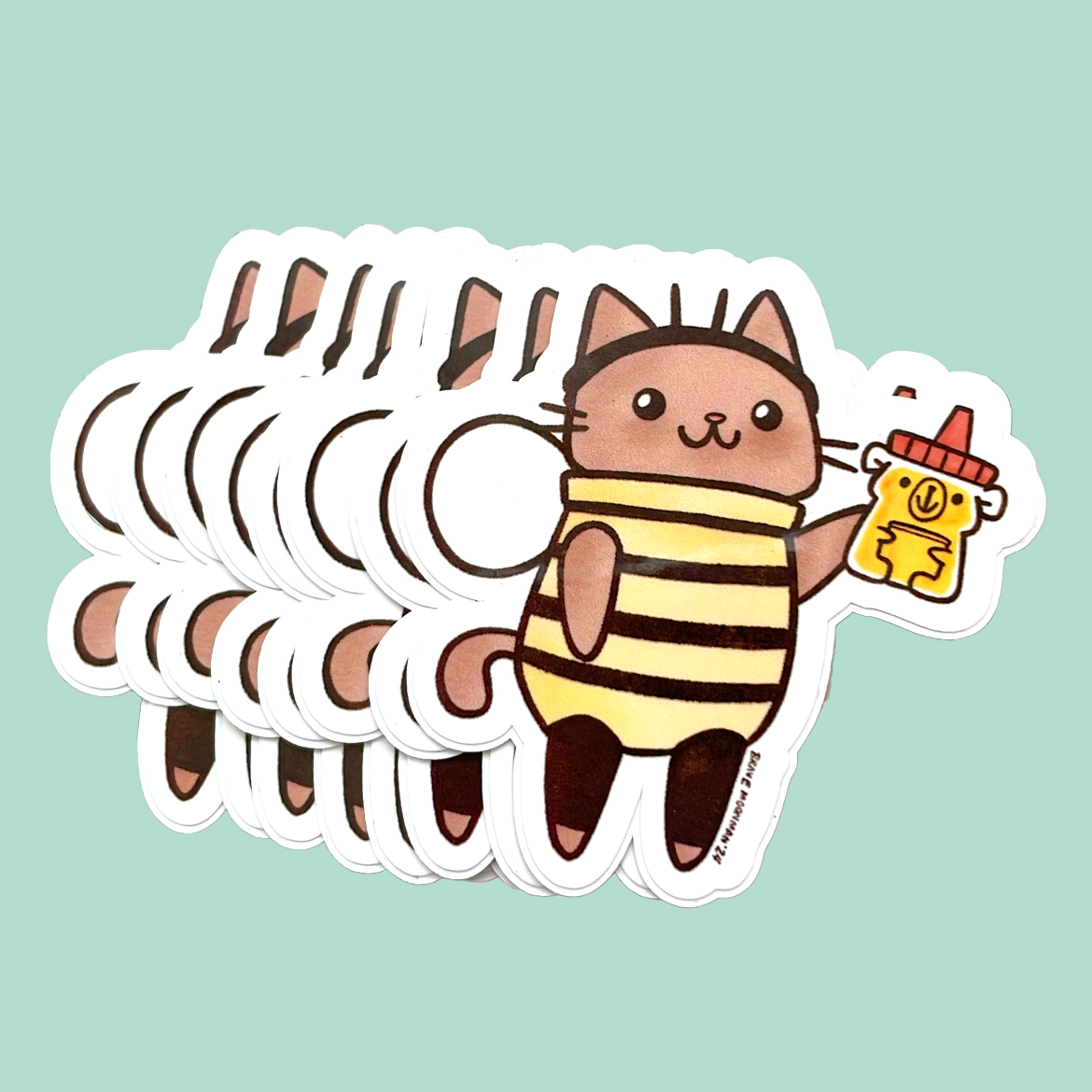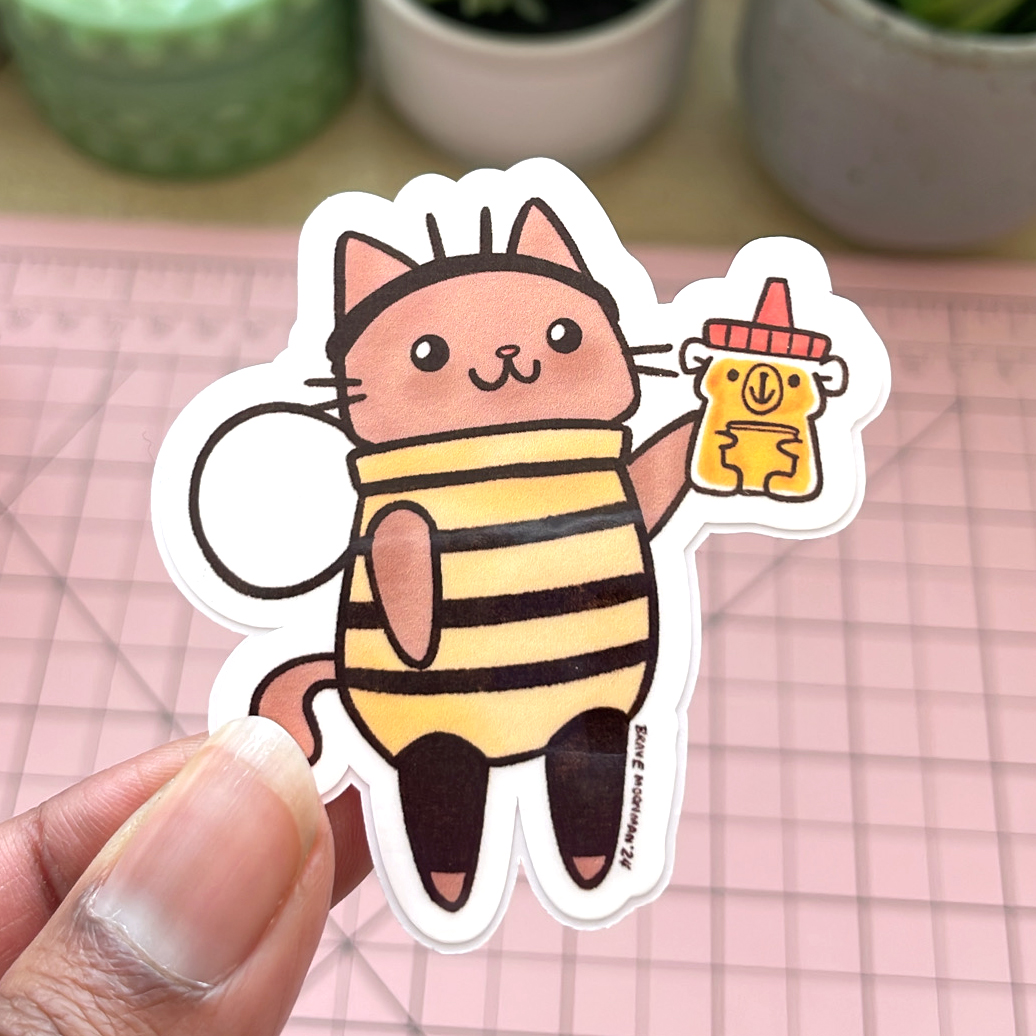 This sweet vinyl sticker features Honey Cat, the cat in a bee costume, with a bottle of honey bear honey!
