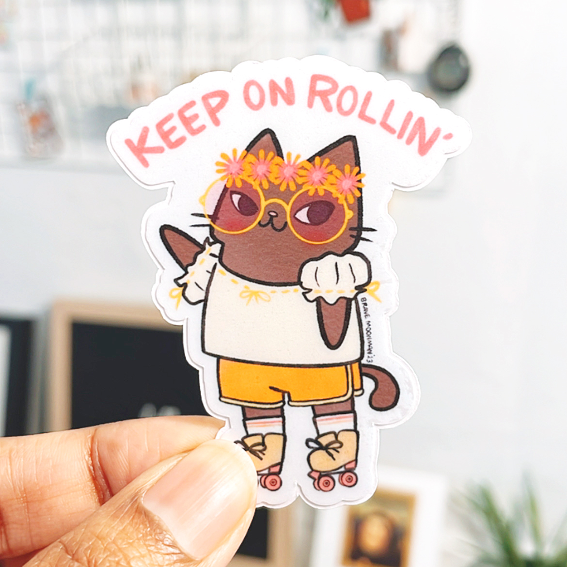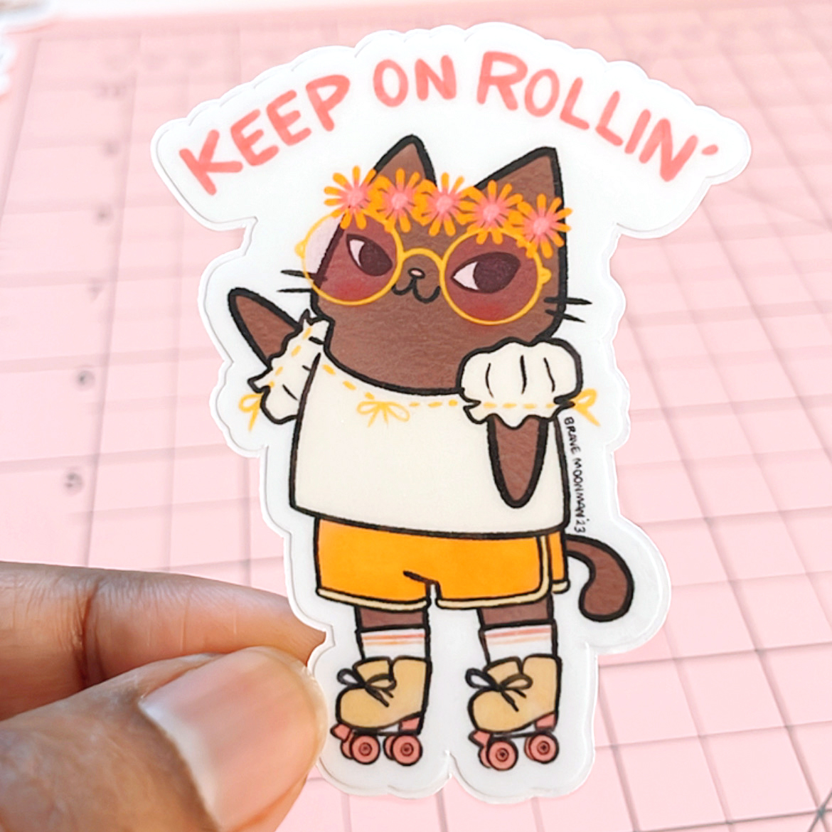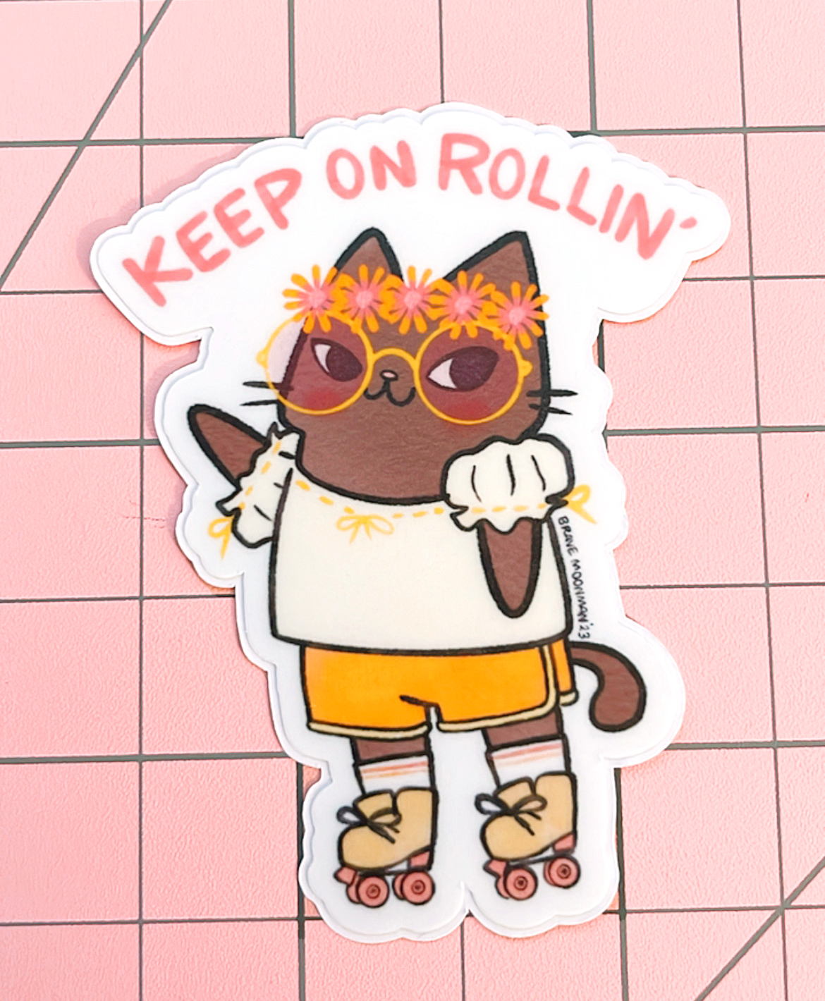 Cute vinyl sticker featuring Boho Cat in rollerskates!  Caption reads “Keep on Rollin.'”