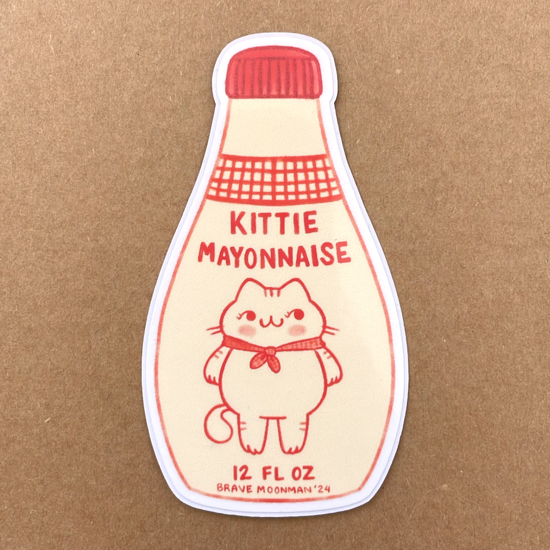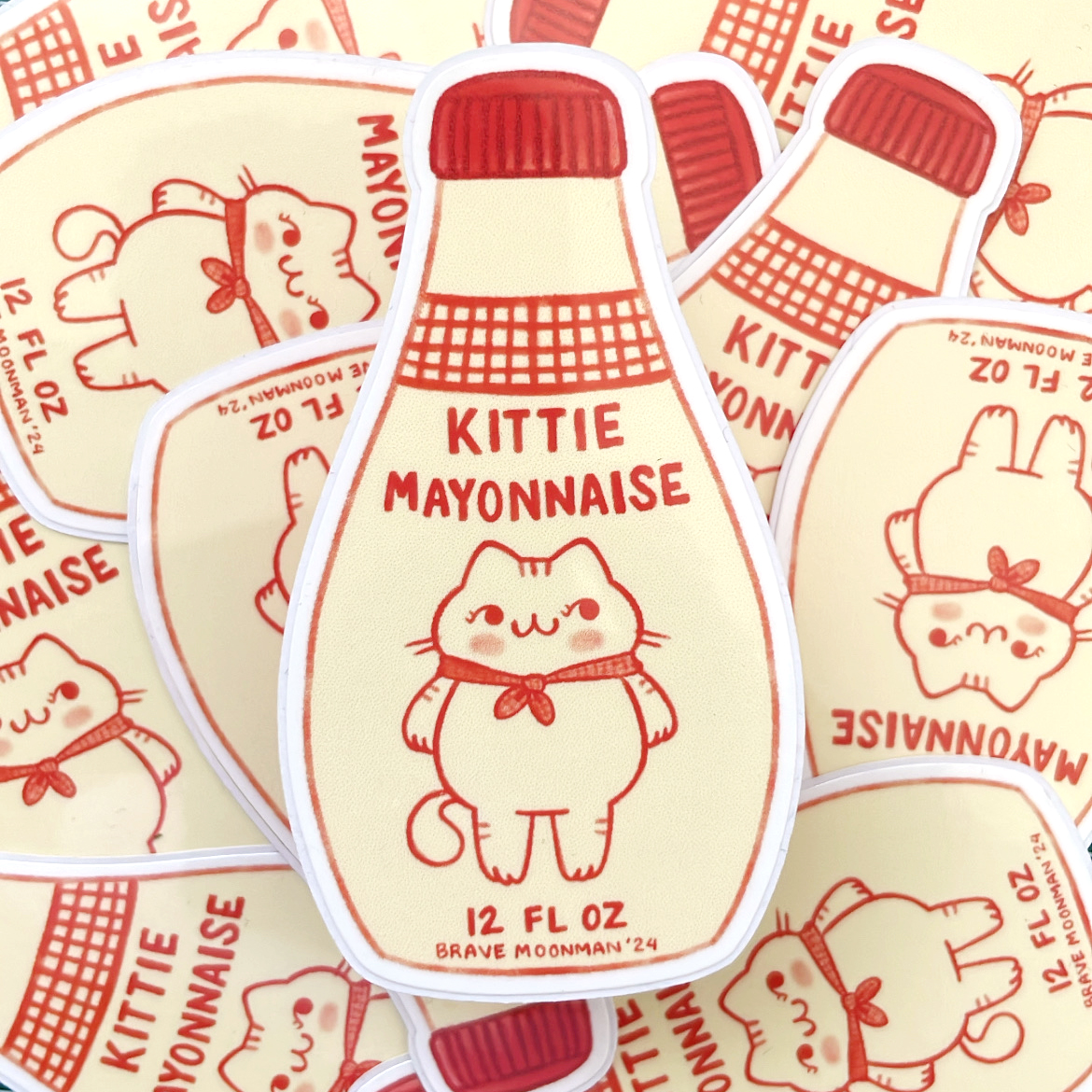 This cute vinyl sticker features a super cute condiment, a bottle of kittie mayonnaise with a cat kewpie mayo mascot!