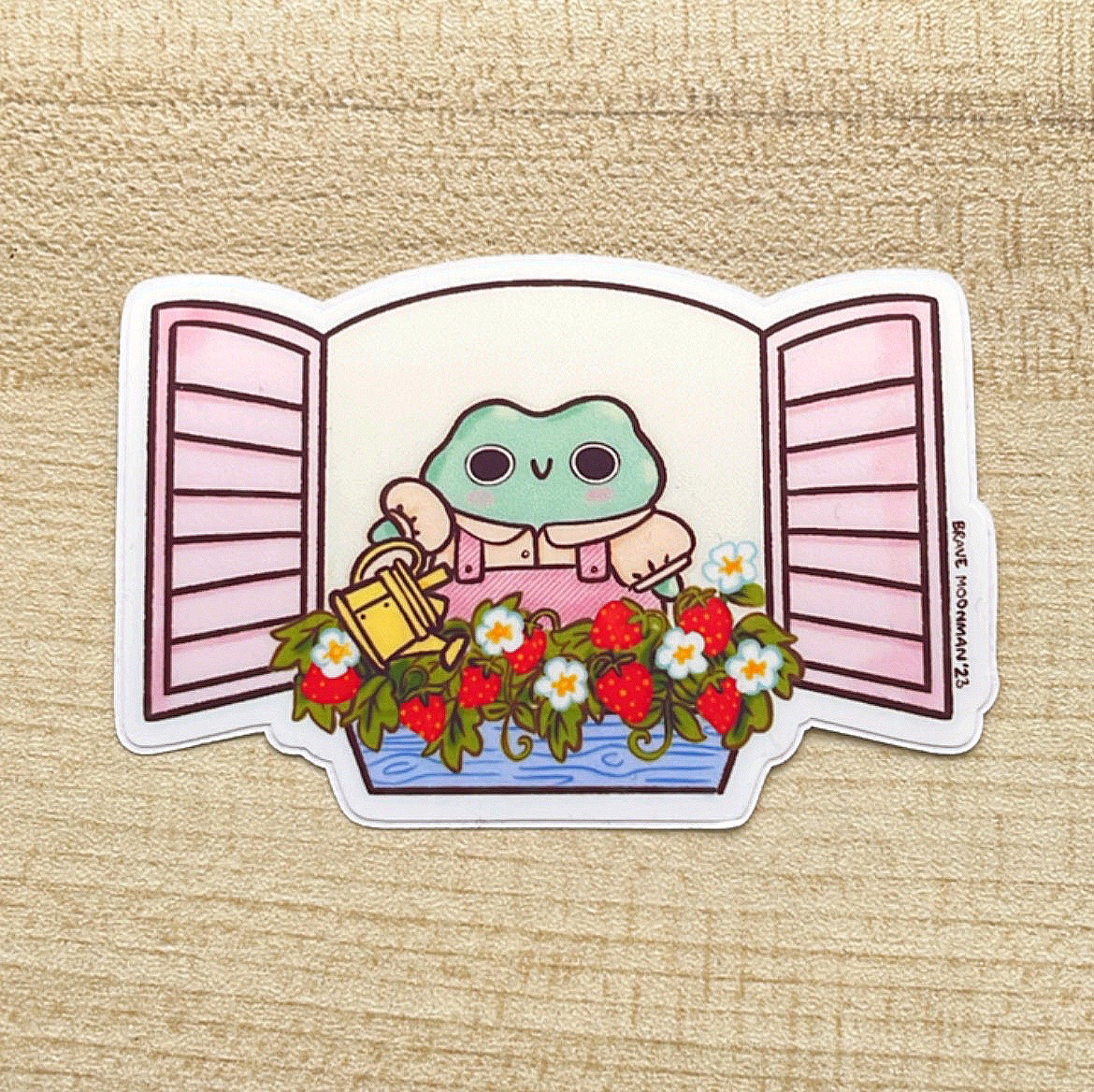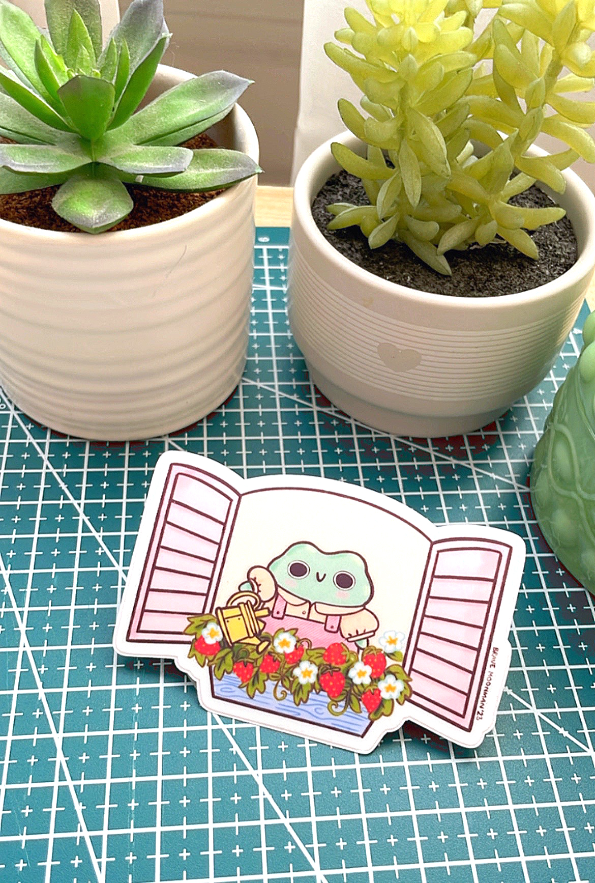 This cute vinyl sticker features an adorable frog growing strawberries in a window box!