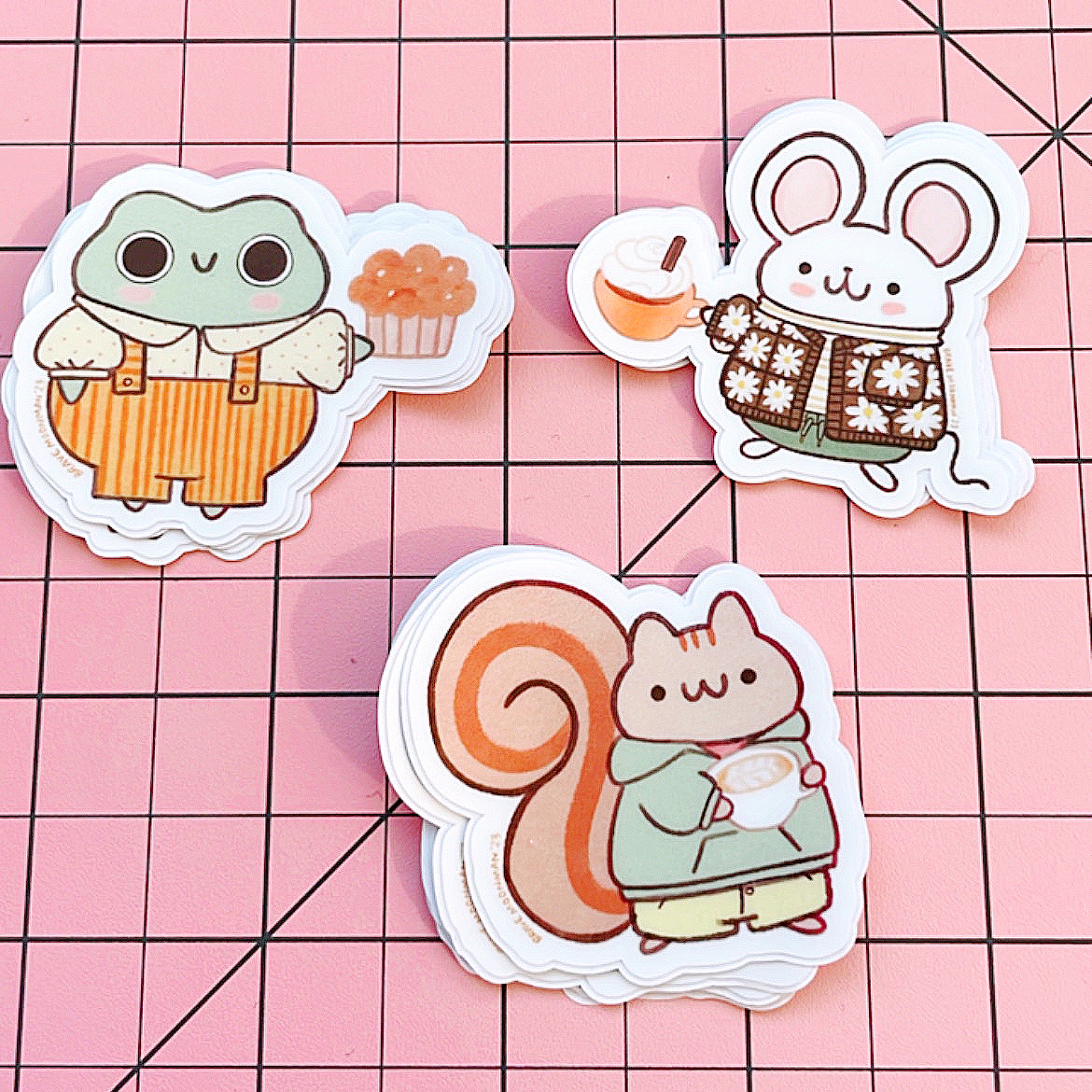 Cute vinyl sticker set featuring three adorable animals savoring pumpkin spice drinks and treats.