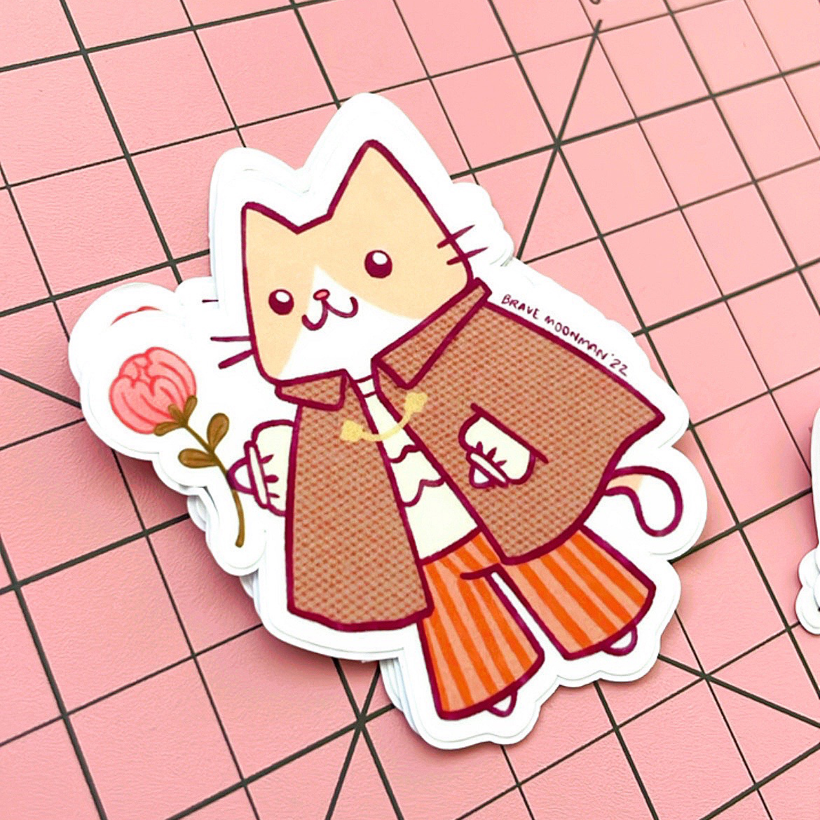 This cute vinyl sticker features Sensitive Cat in a puffy shirt, groovy striped pants and a cape!