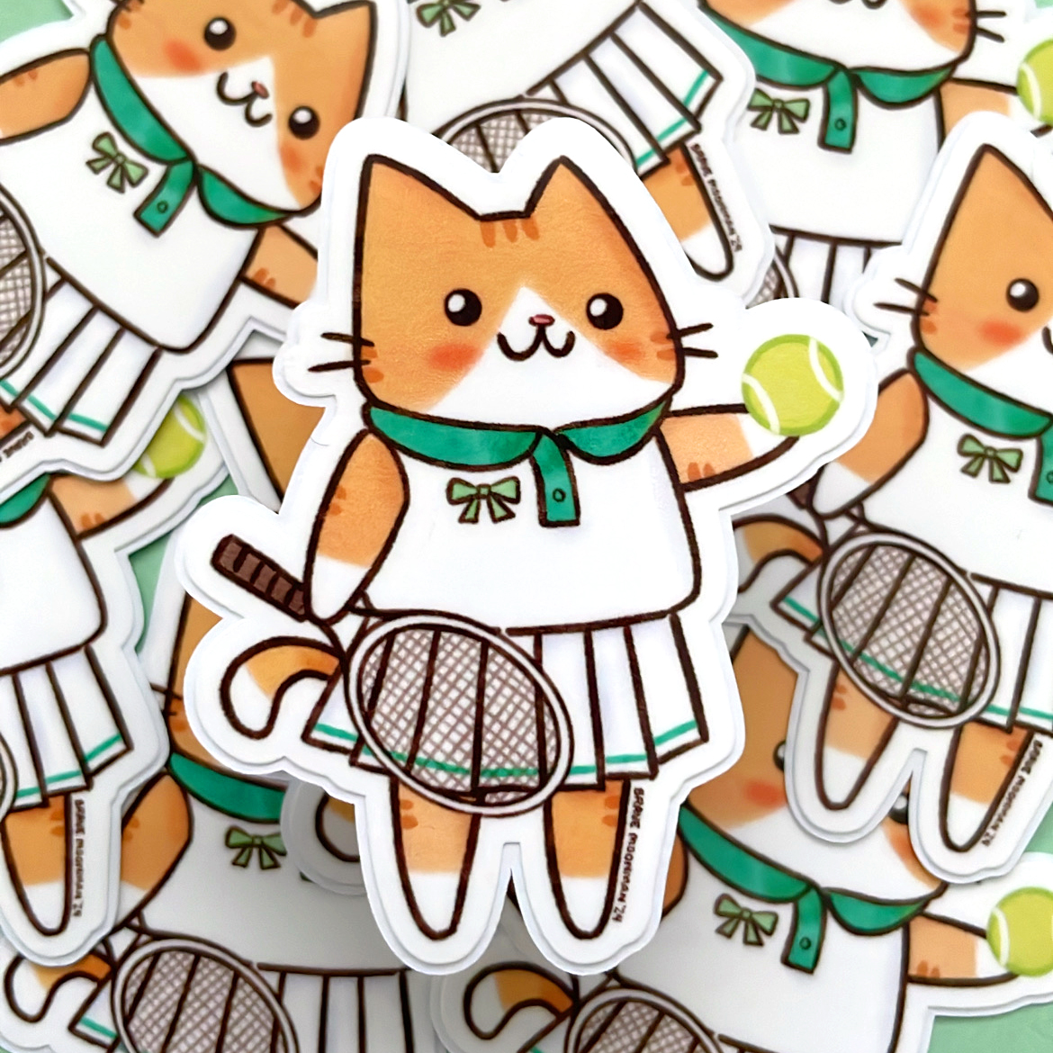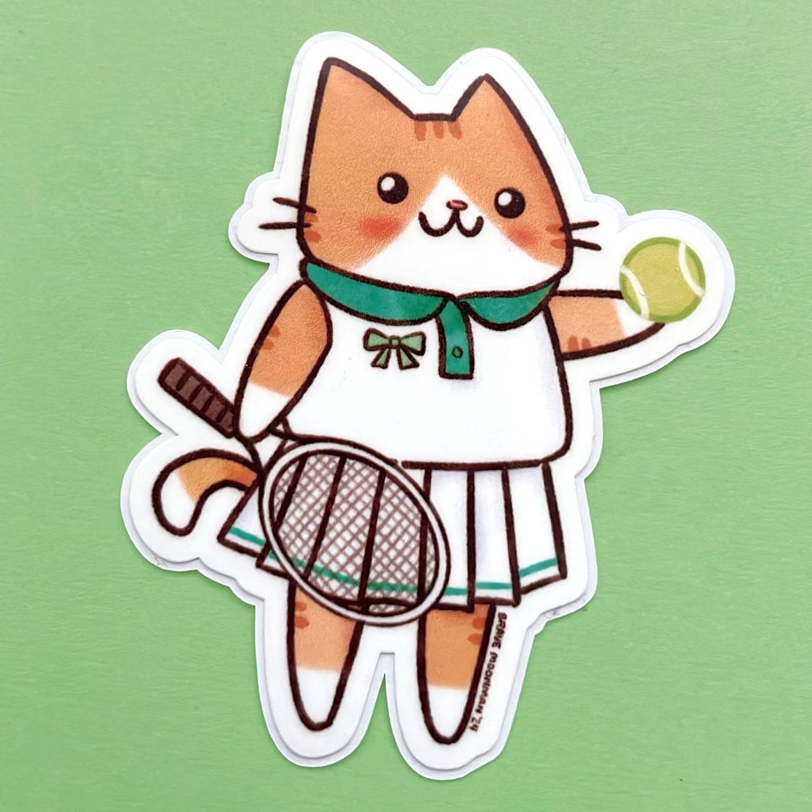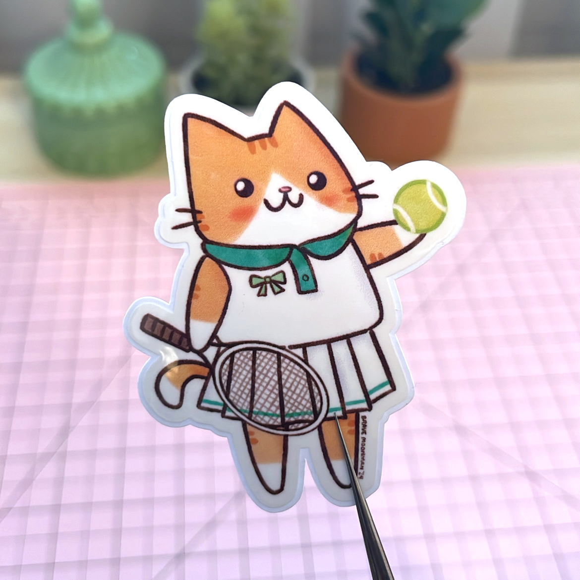 This cute vinyl sticker features Tennis Cat, ready for a game!